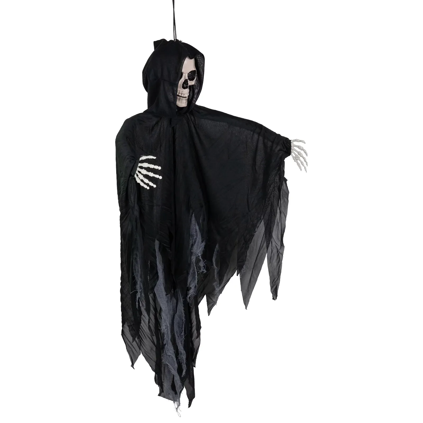 Place the Hanging Grim Reaper Figure near the entrance or doorway to immediately set a spine-chilling tone for your haunted house. It serves as a haunting greeter, signaling visitors are stepping into darkness and dread. Some Hanging Grim Reaper Figures are designed with animated or swinging features, causing the figure to sway or lunge as visitors pass. This unexpected movement can startle and unnerve guests, adding an interactive element to your haunted house. Incorporate the Grim Reaper figure into your haunted house’s narrative. It can symbolize death or be the harbinger of doom, telling a story of tragedy and despair.